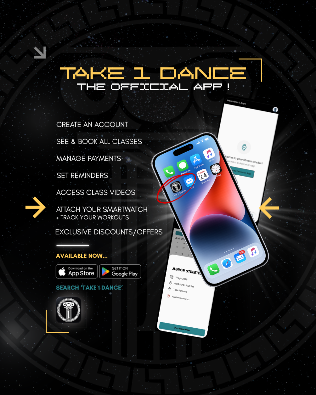 Stay connected with us. Our ‘@take1dance’ page is a gateway to our social media feeds (instagram) Follow us for live class updates via our insta story, team achievements and other exciting news!